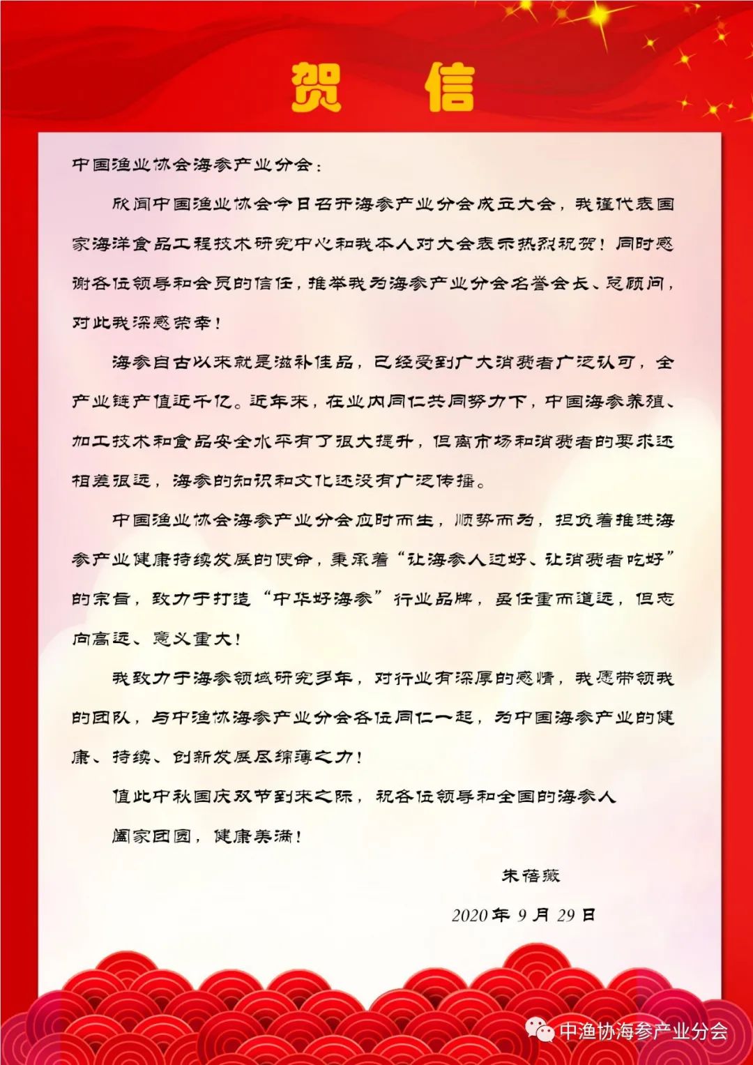 中国海参产业自2003年非典开始进入黄金发展期,经过17年的发展,逐步形成近千亿的产业规模。为进一步引领和规范海参行业,实现“让海参人过好,让消费者吃好”的目标,2020年9月29日中国渔业协会批准成立海参产业分会,朱蓓薇院士接受协会邀请,出任首届名誉会长兼总顾问,并为成立大会发来贺信。