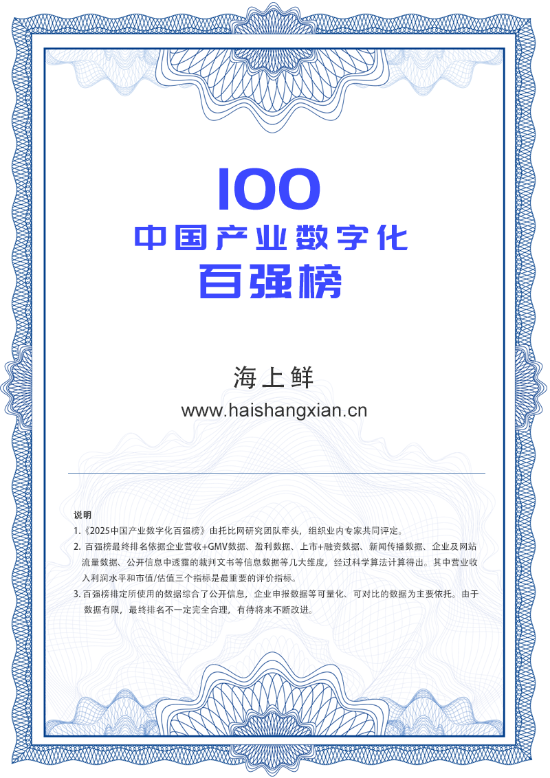 该系列榜单由托比网发布,至今已连续推出十二届,被广泛视为衡量产业数字化进程的关键参考。“2025产业数字化百强榜”重点关注具备成熟商业模式与稳健盈利能力的企业,从营收利润、融资上市、行业影响力、创新成长性等多个维度进行综合评估,结合科学算法分析得出结果,具有较高的行业公信力。 本届产业数字化大会以 “数聚鼓楼,智联全球” 为主题,还专门开设了 AI 应用、中德合作、出海发展三大论坛,重点探讨产业与 AI 结合的创新做法,以及国际间的产业协同。此次海上鲜再度入选百强榜,是对其在海洋(渔业)数字化服务领域的持续创新与领先实践的肯定,更标志着其赋能渔业供应链升级、打通国内外贸易数字化通道的领先能力。 未来,海上鲜将积极参与全国统一大市场建设,进一步夯实国内海洋渔业数字化基础,同时加快推动中国渔业数字化能力走向全球,为实现海洋经济的高质量发展注入持续动能。 来源:海上鲜一站式数字海洋(渔业)服务平台