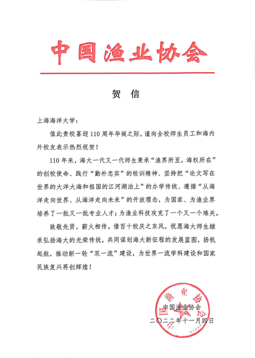 中国渔业协会向上海海洋大学建校110周年发来贺信,谨向全校师生员工和海内外校友表示热烈祝贺!