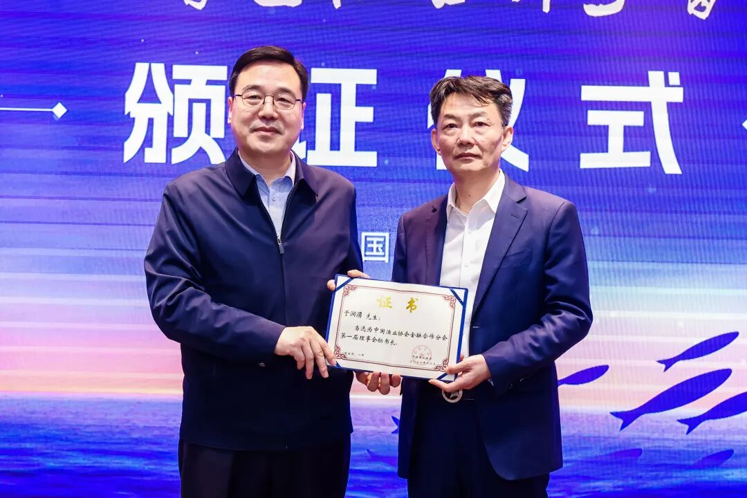 协会赵兴武会长和分会郑凯会长共同为中国渔业协会金融合作分会揭牌。协会赵兴武会长为太平洋安信农业保险股份有限公司颁发了会长单位牌匾。协会赵兴武会长、李胜利书记分别为分会当选副会长、秘书长和常务理事颁发了证书。分会当选秘书长于涧湧向会员报告了金融合作分会五年发展规划。