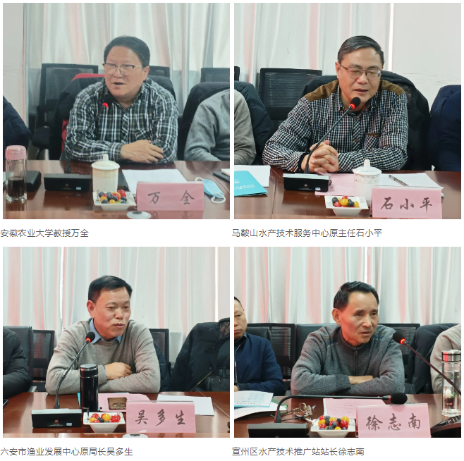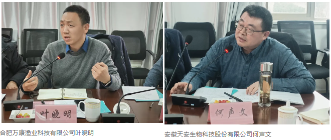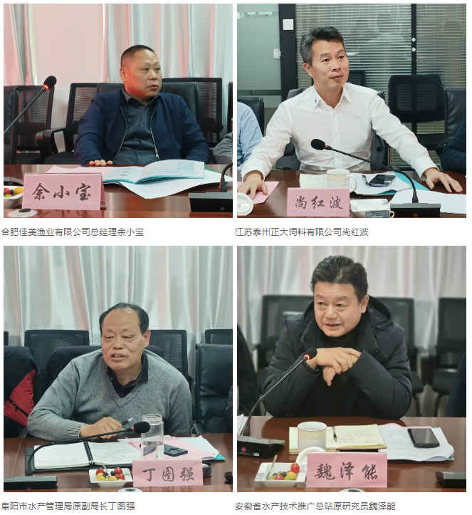 本次会议由安徽省水产技术推广总站原副站长、中国渔业协会安徽代表处主任蒋军主持,安徽农业大学教授万全、马鞍山水产技术服务中心原主任石小平、六安市渔业发展中心原局长吴多生、宣州区水产技术推广站站长徐志南、合肥佳美渔业有限公司总经理余小宝、江苏泰州正大饲料有限公司尚红波、阜阳市水产管理局原副局长丁图强、安徽省水产技术推广总站原研究员魏泽能、合肥万康渔业科技有限公司叶晓明、安徽天安生物科技股份有限公司何声文等行业专家出席会议,中国渔业协会秘书长助理庞丽霞、会展部副主任刘梦楠线上参会。