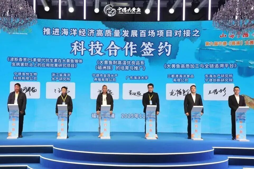 大会现场发布了大黄鱼锥体虫现场快速检测、大黄鱼深远海养殖新品系创制技术、养殖大黄鱼品质控制与高值利用关键技术及应用等大黄鱼产业科研成果;举行了科技、产业、银企等方面的合作签约仪式。