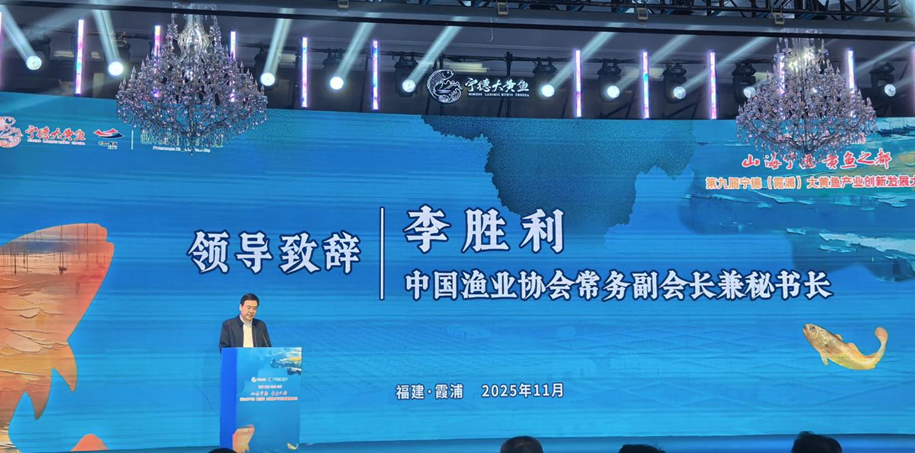 李胜利常务副会长兼秘书长在致辞中指出,宁德市以“国鱼计划”为战略引领,统筹推进种苗培育、生态养殖、精深加工、品牌打造、市场拓展全链条升级。今年,宁德市又成立大黄鱼产业专班与产业协会,为产业高质量发展注入强劲动力,充分彰显了打造世界级大黄鱼产业集群的坚定决心与责任担当。他指出,2014年中国渔业协会在宁德成立了大黄鱼分会。分会成立以来,通过编撰产业发展报告、制定行业标准规范、组织企业参与展会、开展技术培训与质量检测、推进产品追溯体系建设、推动跨区域合作培育硇洲族大黄鱼苗种等一系列务实举措,持续促进产业协同创新,有效破解发展瓶颈难题。他强调,中国渔业协会愿继续与宁德市深化战略合作,共同提升宁德大黄鱼的品牌价值与核心竞争力,携手谱写大黄鱼产业高质量创新发展的崭新篇章。