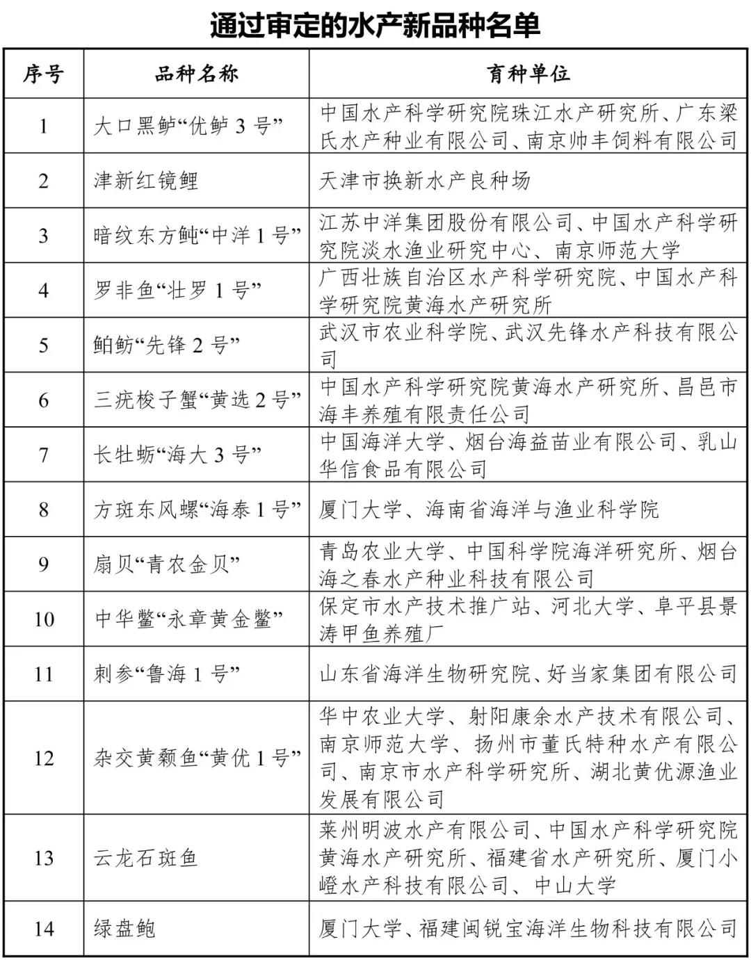 大口黑鲈“优鲈3号”等14个水产新品种经全国水产原种和良种审定委员会审定通过。根据有关规定,现将结果予以公示,公示期为两周,从2019年2月18日起,至2019年3月3日结束。公示期内,任何单位、组织、个人对本公示所列的水产新品种有异议的,请向全国水产原种和良种审定委员会秘书处提出。