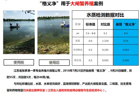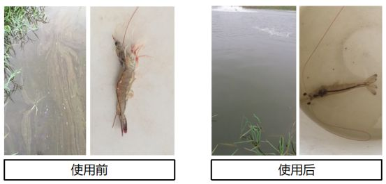 —2019年4月26日施用“格义净”,约4个小时后,水色变清爽,虾吃食活跃,3~4天后,断肠和红脚等虾病缓解,蓝藻生长得到控制和去除;