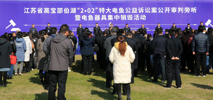 当日,农业农村部长江办联合江苏省高级人民法院、人民检察院、农业农村厅和扬州市人民政府,组织各级各有关部门和渔民代表共100余人,在扬州旁听了“2.02”特大电鱼公益诉讼案宣判活动,并现场组织放流鲢鳙鱼、草鱼等约500万尾,集中销毁电鱼器具、非法捕捞网具1000余(套)顶。