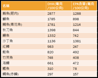 一般来说,脂肪含量高的鱼类、背部青色的鱼类,体内含有较高的EPA、DHA。如金枪鱼、秋刀鱼、沙丁鱼、青花鱼、鲅鱼、鳗鱼、三文鱼、鲑鱼、虹鳟、宝石鲈等。
