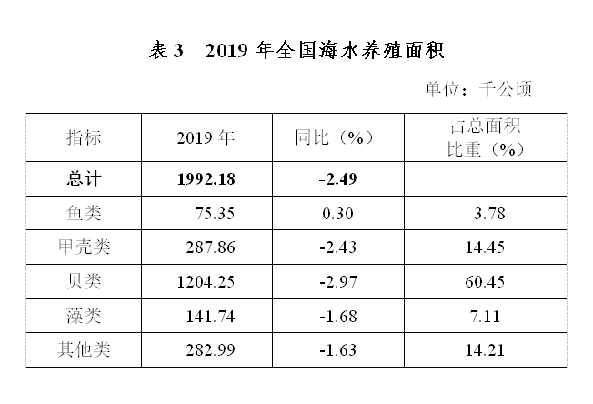 全国水产养殖面积7108.50千公顷,同比下降1.13%。其中,海水养殖面积1992.18千公顷,同比下降2.49%;淡水养殖面积5116.32千公顷,同比下降0.59%;海水养殖与淡水养殖的面积比例为28.0:72.0。