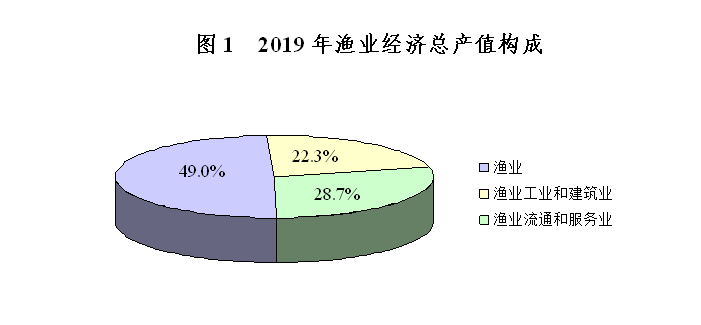 按当年价格计算,全社会渔业经济总产值26406.50亿元,其中渔业产值12934.49亿元,渔业工业和建筑业产值5899.17亿元,渔业流通和服务业产值7572.83亿元,三个产业产值的比例为49.0:22.3:28.7。渔业流通和服务业产值中,休闲渔业产值963.68亿元,同比增长6.81%。