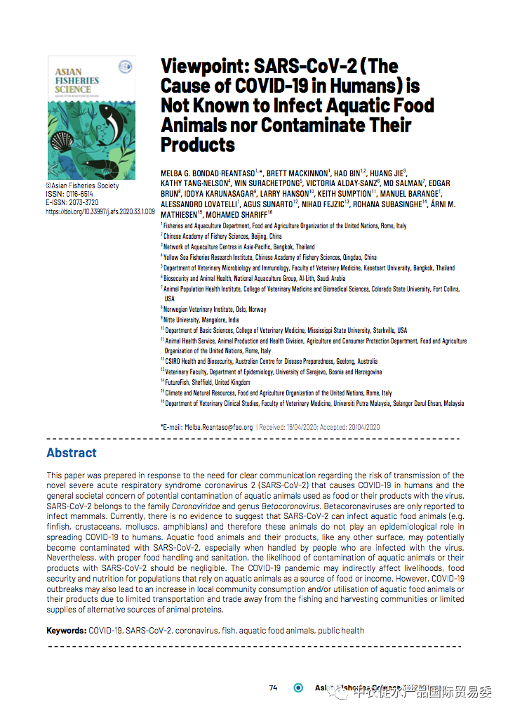 论文由来自包括联合国粮农组织、中国水产科学研究院、中国水产科学院黄海水产研究所等机构在内的一些全球著名水生动物病害、检疫、养殖、渔业、食品安全等方面专家共同撰写,旨在消除人们对新冠病毒可能感染水产品的恐惧心理。