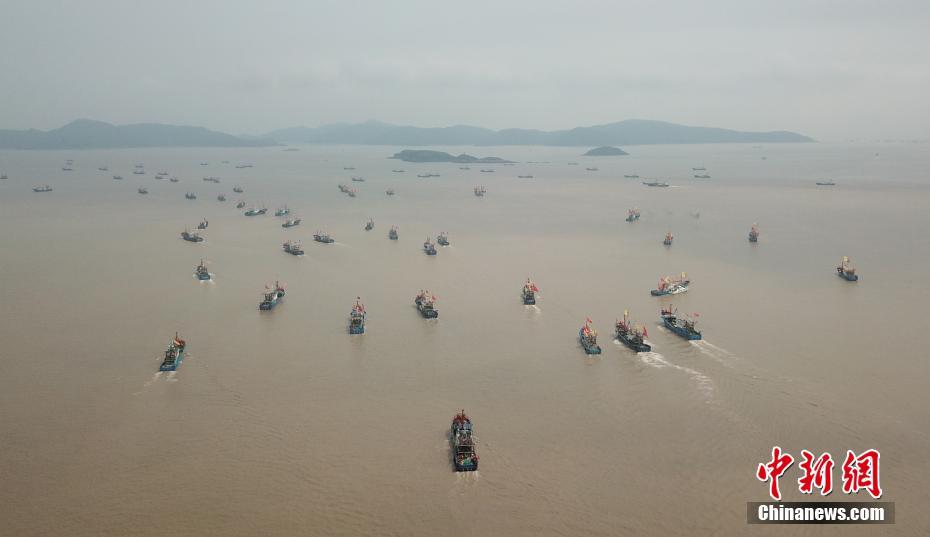 9月16日,宁波象山大量渔船出海作业。当日12时起,中国东海结束为期四个半月的伏季休渔,全面开捕。浙江宁波象山1298艘渔船离港驶向东海开始捕鱼作业,再现“千舟竞发”盛景。(航拍图片) 中新社记者 王刚 摄
