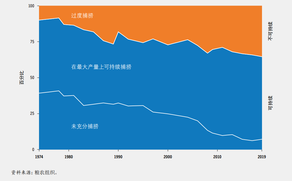 粮农组织强调,要在满足不断增长的世界人口需求的同时着眼长远,加强种群和脆弱生态系统的可持续性,保护人们的生活和生计,需要做出更多努力。根据2022年版《世界渔业和水产养殖状况》报告的数据,海洋渔业资源的可持续性仍然令人深感忧虑,2019年可持续捕捞种群的比例下降至64.6%,比2017年的水平低了1.2%。1974-2019年世界海洋渔业资源状况全球趋势。©粮农组织然而,也存在令人鼓舞的迹象:可持续渔业种群占2019年总上岸量的82.5%,比2017年提高了3.8%。这似乎表明,规模较大的种群得到了更为有效的管理。粮农组织积极推进“蓝色转型”。这是一项富有远见的战略,旨在同时应对粮食安全和环境可持续性的双重挑战,并确保成果公平和性别平等。为推动变革,气候和环境友好型政策与做法以及技术创新也不可或缺。