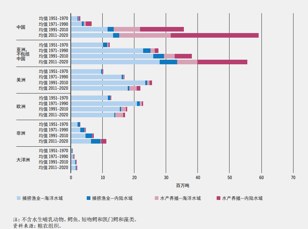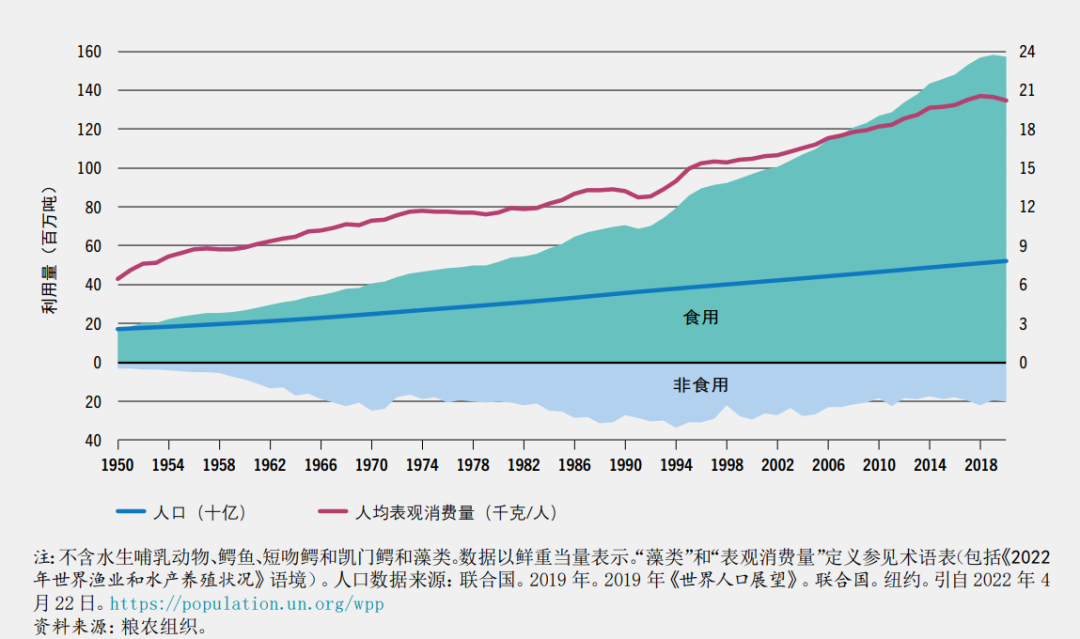 1950-2020年世界捕捞渔业和水产养殖产量。©粮农组织