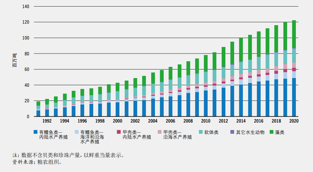 2020年水生动物产量比本世纪头十年的平均水平高出30%,比20世纪90年代的平均水平高出60%以上。这一成就的取得在很大程度上得益于水产养殖业的增长,该产业的水生动物产量创造了8750万吨的历史最高纪录。