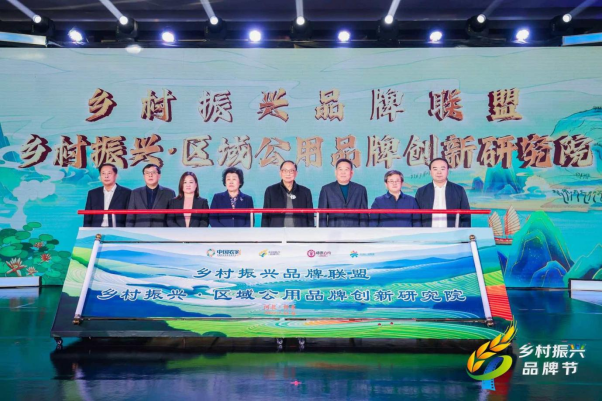 原国务院扶贫办主任、原农业部副部长、全国乡村文化产业创新联盟主席刘坚,原农业部党组成员、中国农产品市场协会会长张玉香,中国渔业协会会长赵兴武,中国农业科学院信息研究所所长周清波,农业农村部信息中心党委副书记、纪委书记张游,中国交通运输协会运输与物流分会会长王恩森,中国农业电影电视中心党委委员张天佑,北京字节跳动公益基金会副理事长杨洁共同上台,见证“乡村振兴品牌联盟”正式成立、“乡村振兴·区域公用品牌创新研究院”正式揭牌。