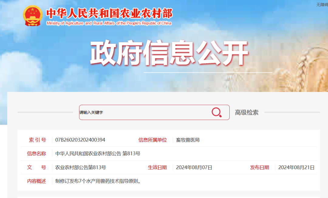 为进一步加强水产养殖用兽药研究指导工作,规范新兽药研究活动,加快兽药产品创新和上市应用,根据《兽药管理条例》等有关规定,我部组织修订了《水产养殖用抗菌药物药效试验技术指导原则》等5个兽药技术指导原则,制定了水生动物疫苗实验室安全试验和效力试验等2个兽药技术指导原则,现予发布,请参照执行。原农业部公告第2017号同时废止。