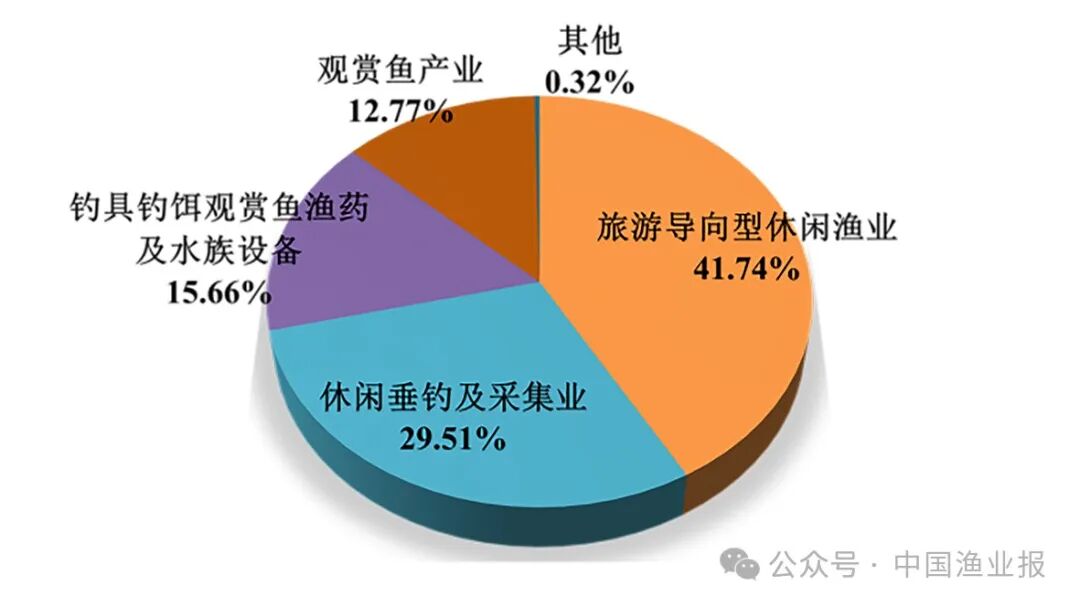 根据农业农村部休闲渔业监测分类,我国休闲渔业分为5种类型,分别是:旅游导向型休闲渔业、休闲垂钓及采集业、钓具钓饵观赏鱼渔药及水族设备、观赏鱼产业和其他。从占比来看,旅游导向型休闲渔业、休闲垂钓及采集业为主导产业,2023年产值分别为388.78亿元、274.85亿元,合计占全国产值的71.25%;钓具钓饵观赏鱼渔药及水族设备、观赏鱼产业产值分别为145.83亿元、118.99亿元,分别占比15.66%和12.77%(见图3)。4种主要类型产业产值均有增长,同比增速最快的依次是旅游导向型休闲渔业和观赏鱼产业。