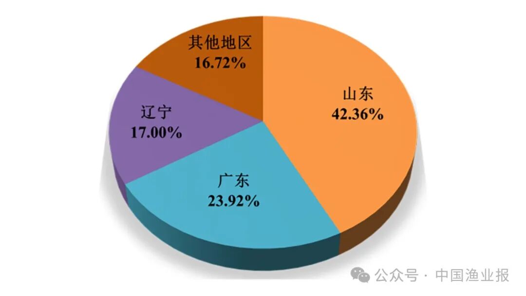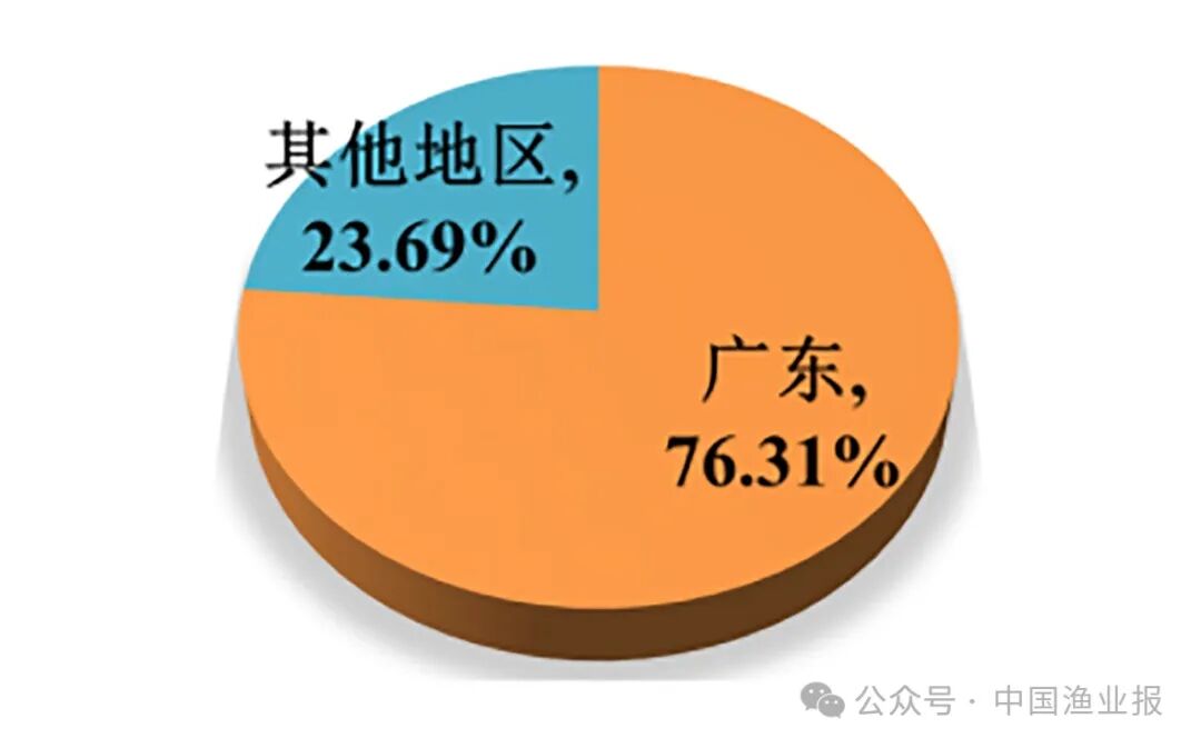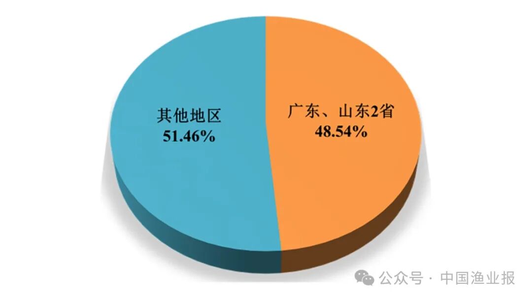 4.观赏鱼产业。2023年,全国观赏鱼产业产值118.99亿元,同比增长7.28%。其中,淡水观赏鱼产值102.16亿元,广东和山东产值分别为25.11亿元和18.36亿元,占全国淡水总产值的42.54%;海水观赏鱼产值16.84亿元,广东产值13.96亿元,占全国海水总产值的82.90%(见图7–1)。广东和山东观赏鱼产业产值合计占全国观赏鱼总产值的48.54%(见图7–2)。