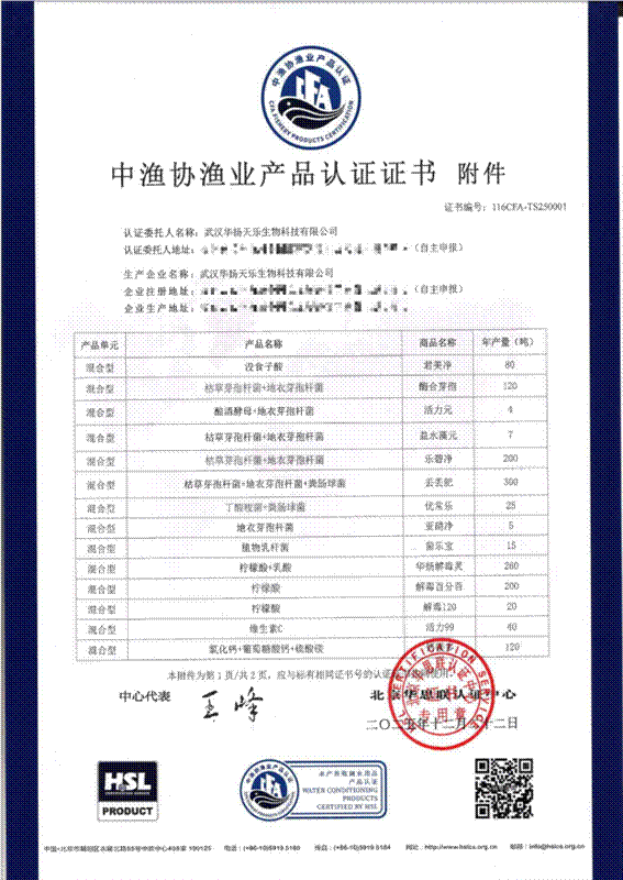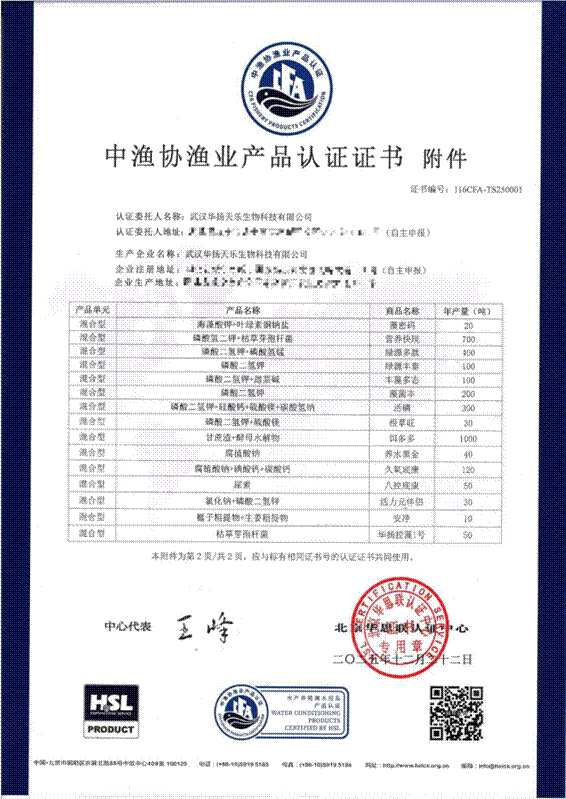 能够斩获此项权威认证,源于公司始终坚持严守食品安全底线,在产品研发及品控上高标准、严要求。武汉华扬天乐生物科技有限公司为国家高新技术企业,为中国渔业协会渔药与调水用品分会的会员单位。公司成立于2012年,于 2020 年 11 月搬迁扩建至湖北咸宁高新技术开发区,一期项目占地 5 万余平方米,配备 11条生产线,年设计产能达 20 万吨。