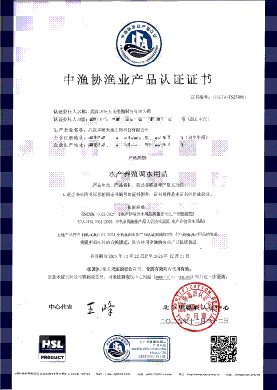 本次获得的CFA认证证书编号为116CFA-TS250001,依据TSCFA0022-2025《水产养殖调水用品质量安全生产管理规范》等多项行业标准,华扬天乐共29个产品通过认证。