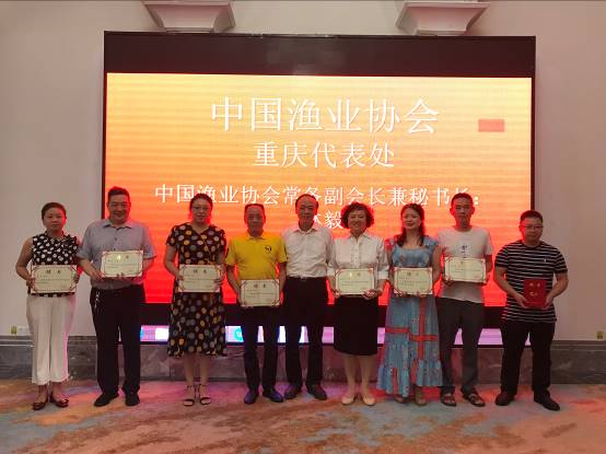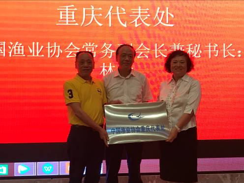林毅秘书长向廖守国主任和赵瑞然执行主任授予中国渔业协会重庆代表处牌匾,并为重庆代表处负责人颁发了聘书。
