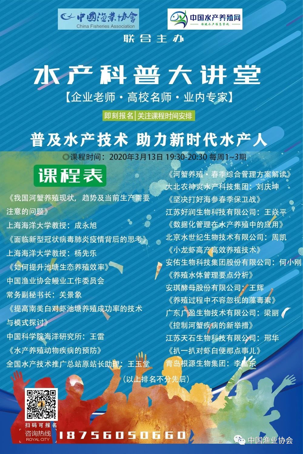3月13日起,中国渔业协会联合水产养殖网按照“科学管理、精准施策”的防控工作要求。面对复杂严峻的产业形势,关注广大养殖户的所急、所盼、所忧、所思。积极作为,联合推出“水产科普大讲堂”网络直播课,解读政策、教授技术、助力宣传、解决问题。在线直播课程的开展将引领水产技术推广步入直播新时代。通过开展线上技术培训指导,做好防控期间渔业稳产以及技术服务工作,保障养殖生产有序合理进行,最大程度的减少疫情带来的损失。届时将邀请行业内权威专家和学者亲临直播现场授课,详细讲解眼下新一轮养殖周期工作制定和规划注意事项,线上为大家答疑解惑,解决渔业生产过程中的难题。