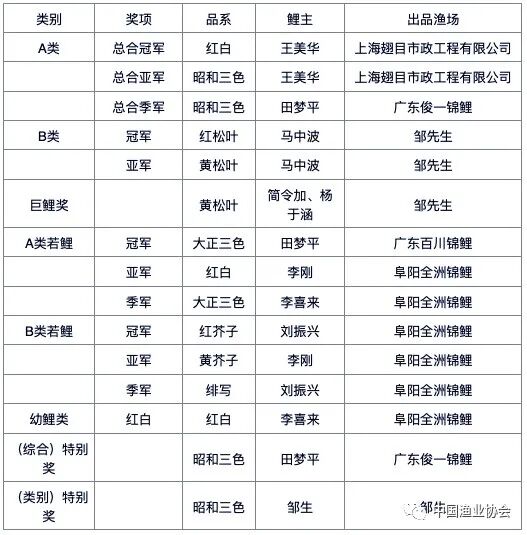 由中国渔业协会锦鲤爱好家分会(筹)主办的第二届“康乐杯”锦鲤品鉴会于11月6日在安徽合肥举办的第四届中国国际现代渔业暨渔业科技博览会上拉开帷幕。本次活动得到了安徽省农业农村厅、安徽省水产技术推广站、安徽省水产学会、江苏省水产学会、安徽省渔业协会、东莞市锦鲤协会的大力支持。由东海锦鲤、金洲锦鲤、广东俊一、苏鲤锦鲤、明宏锦鲤、百川锦鲤、东海龙宫,御锦园,大治锦鲤、小西锦鲤、桃太良锦鲤等渔场提供的400余尾价值数百万元的精品锦鲤一经亮相,便吸睛无数,引来大量观众驻足观看。本次活动还采用了专家与爱好者共同参与评审的形式评选出本届品鉴会的相关奖项,上海翅目市政工程有限公司王美华女士选送的红白和昭和三色获得总合冠军和总合亚军、广东俊一锦鲤田梦平先生选送的昭和三色获得总合季军、马中波、简令加、杨于涵等鲤主分别获得B类、巨鲤、若鲤、幼鲤等组别的冠亚季军。获奖名单如下:
