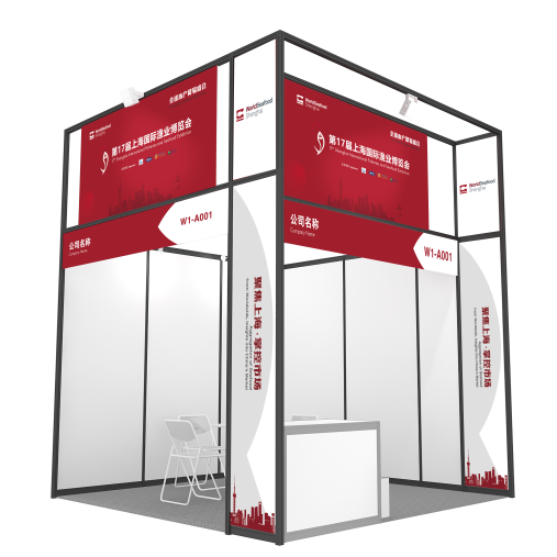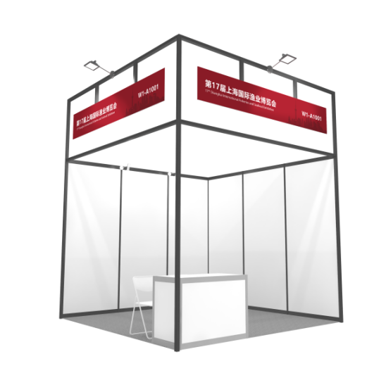 配置:展位加高1米、公司楣板、地毯、2盏射灯、1盏长臂射灯、1张咨询桌、1张洽谈桌、4把折椅、1个垃圾桶、1个插座