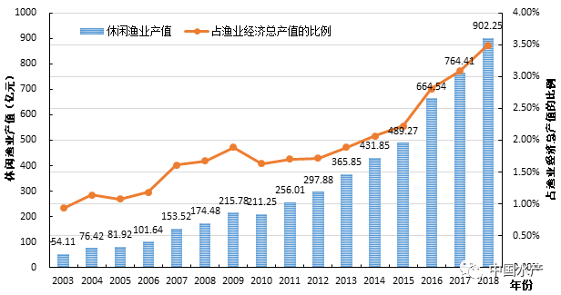 图1 2003年~2018年我国休闲渔业产值及其占渔业经济总产值的比例